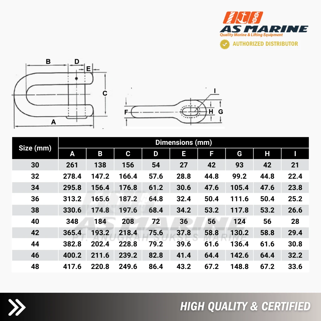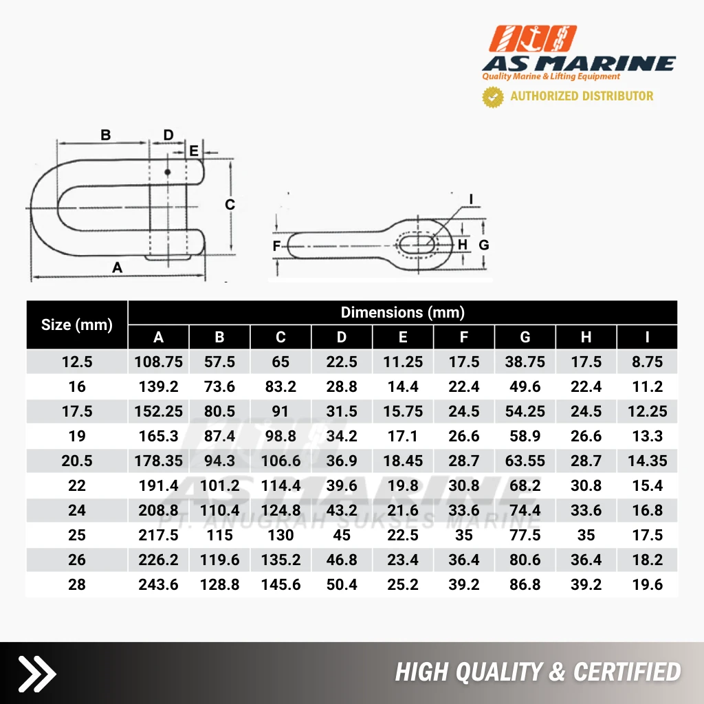 Anchor Shackle Grade U2 terbuat dari baja tempa (forged steel) berkualitas tinggi, Produk ini sesuai dengan standar internasional untuk peralatan kapal laut.
