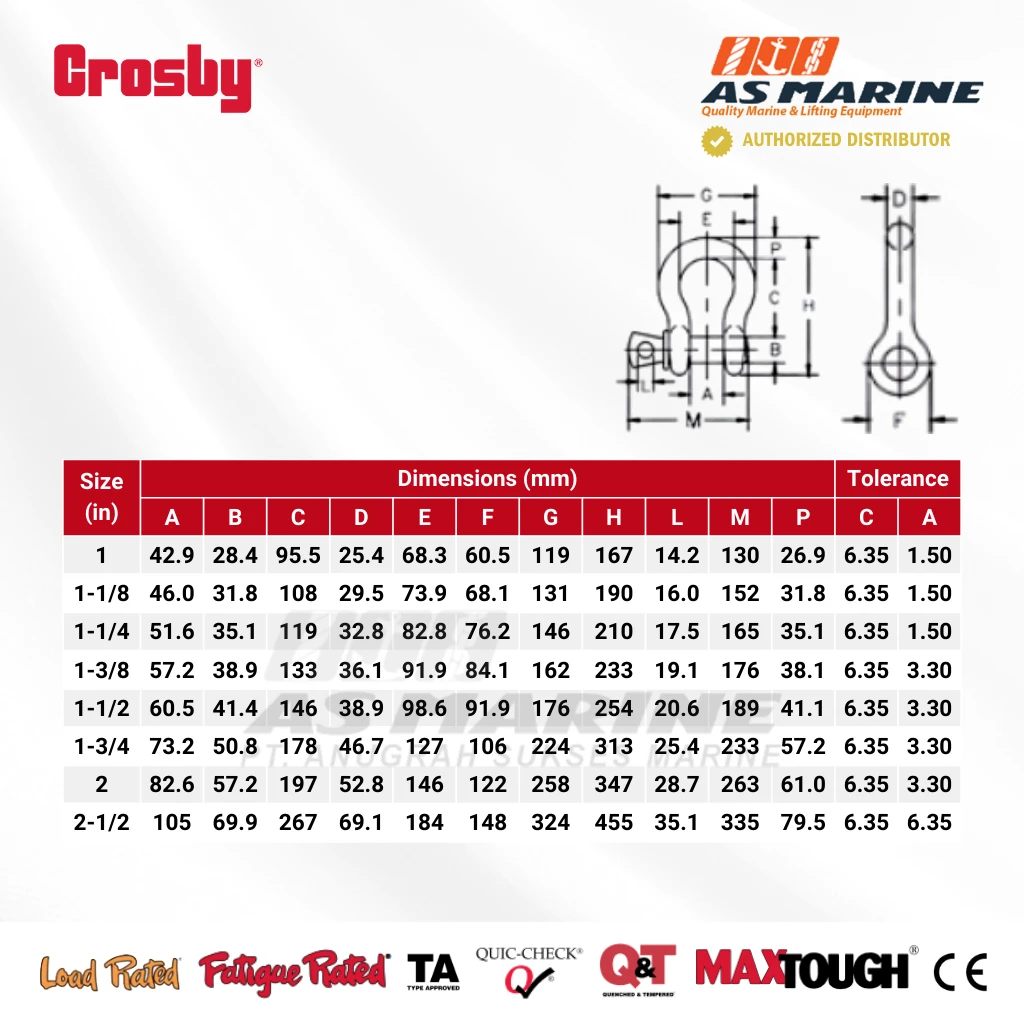 - Standar Kualitas Crosby: Setiap shackle G209 diuji dan disertifikasi untuk memenuhi atau melampaui standar kinerja global, menjamin keamanan dan keandalan di setiap penggunaan.