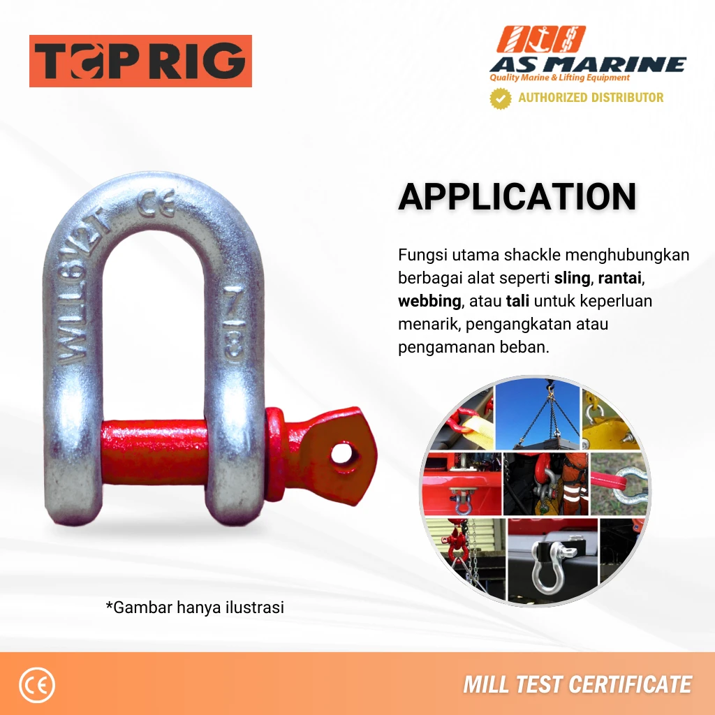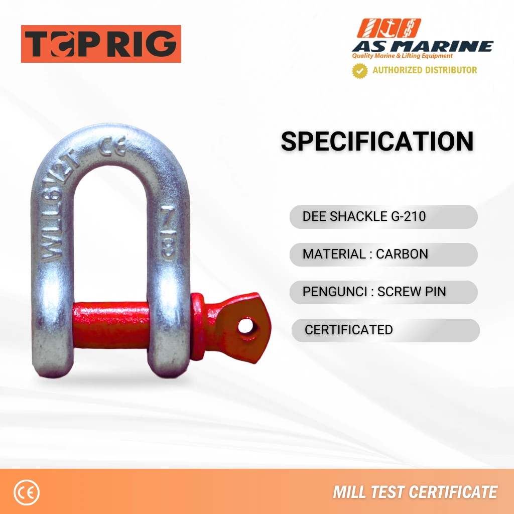 Jual Dee Shackle Screw Pin G210 Toprig kapasitas 0.5 Ton – juga dikenal sebagai Segel D, merupakan salah satu komponen rigging dan lifting yang digunakan untuk menghubungkan wire rope, sling, rantai, atau komponen pengangkat lainnya dengan aman dan kuat.