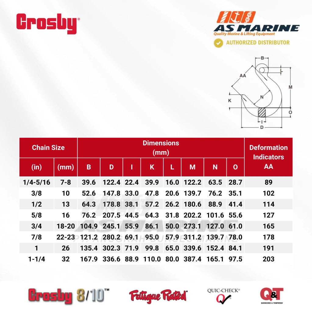 Hook tipe foundry ini memiliki bukaan yang lebih besar dibandingkan hook standar, memungkinkan pengaitannya pada beban yang lebih tebal atau berbentuk unik. Bagian mata (eye) pada pangkalnya memastikan koneksi yang kuat dan aman ke master link atau rantai, menjadikannya komponen krusial dalam sistem sling. Ditempa dari baja paduan berkualitas tinggi, hook ini menjamin ketahanan luar biasa dan umur pakai yang panjang.