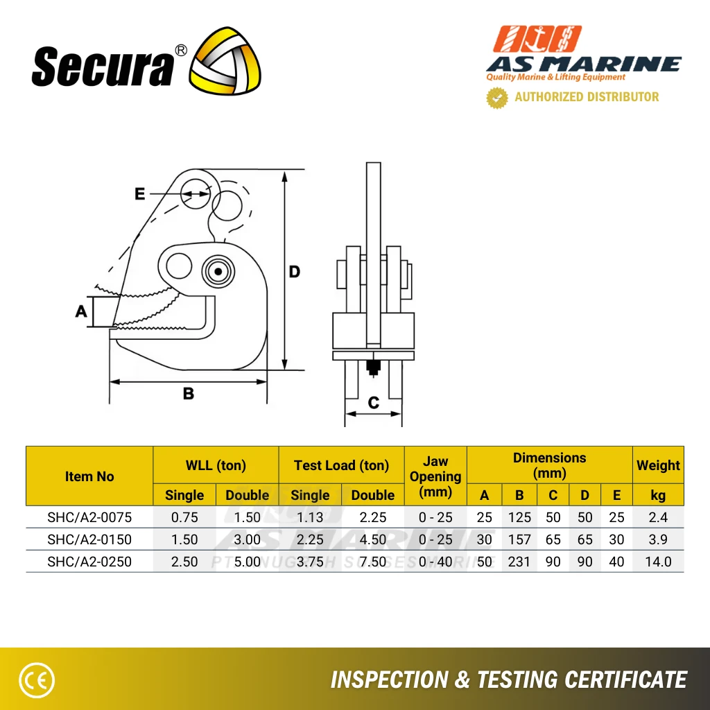 Model SHC/A2 1.5 Ton ini memiliki Working Load Limit (WLL) sebesar 1.5 Ton per unit. Fitur desainnya meliputi rahang penjepit yang bergerigi dan mekanisme pengunci yang kuat untuk menjamin cengkeraman yang mantap pada material sepanjang proses pengangkatan.