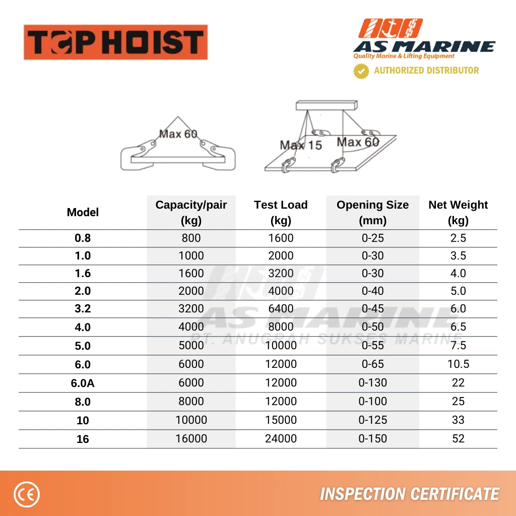 Jual Horizontal Plate Lifting Clamp Tophoist kapasitas 1 Ton – alat pengangkat berkualitas tinggi yang dirancang khusus untuk mengangkat, memindahkan, dan menata plat baja secara horizontal dengan aman dan efisien.