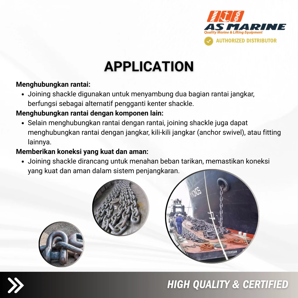 Shackle ini dirancang khusus untuk aplikasi kelautan (marine use) yang membutuhkan sambungan kuat, tahan lama, dan anti karat di lingkungan laut ekstrem.