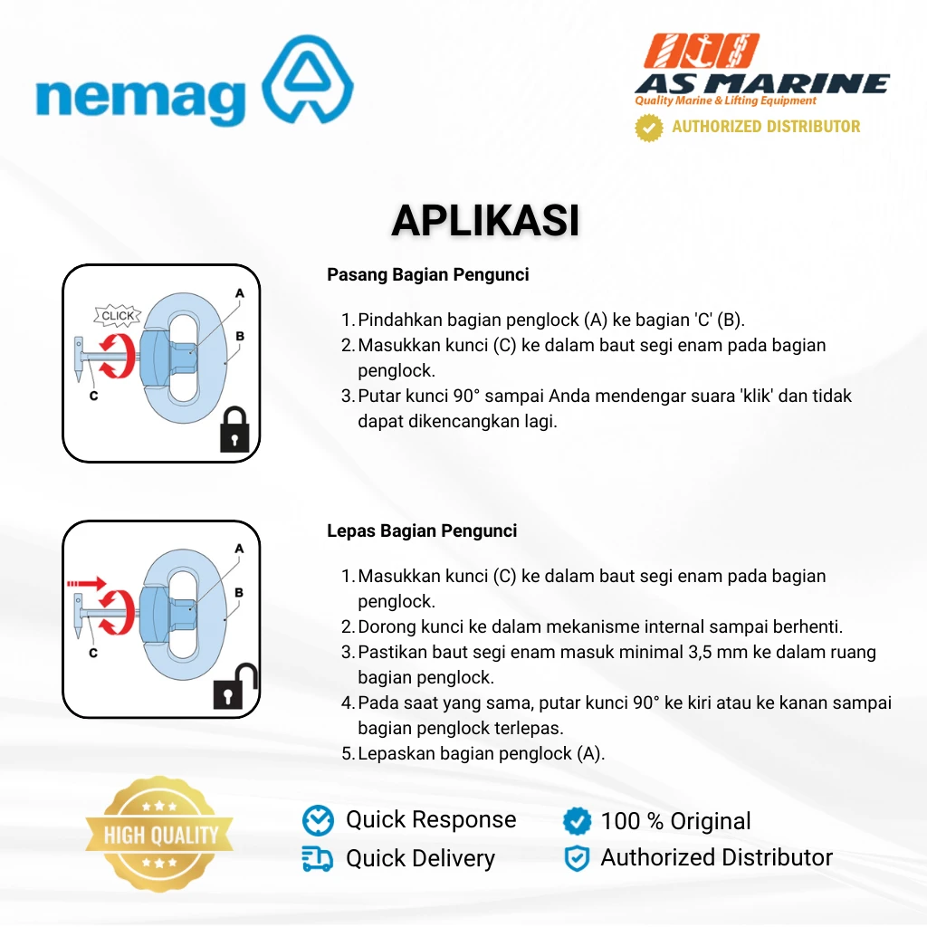 Pastikan operasi rigging Anda berjalan mulus dan aman. Gunakan selalu Nemag Quick Release Link Key asli untuk mengoptimalkan kinerja Quick Release Link Anda.