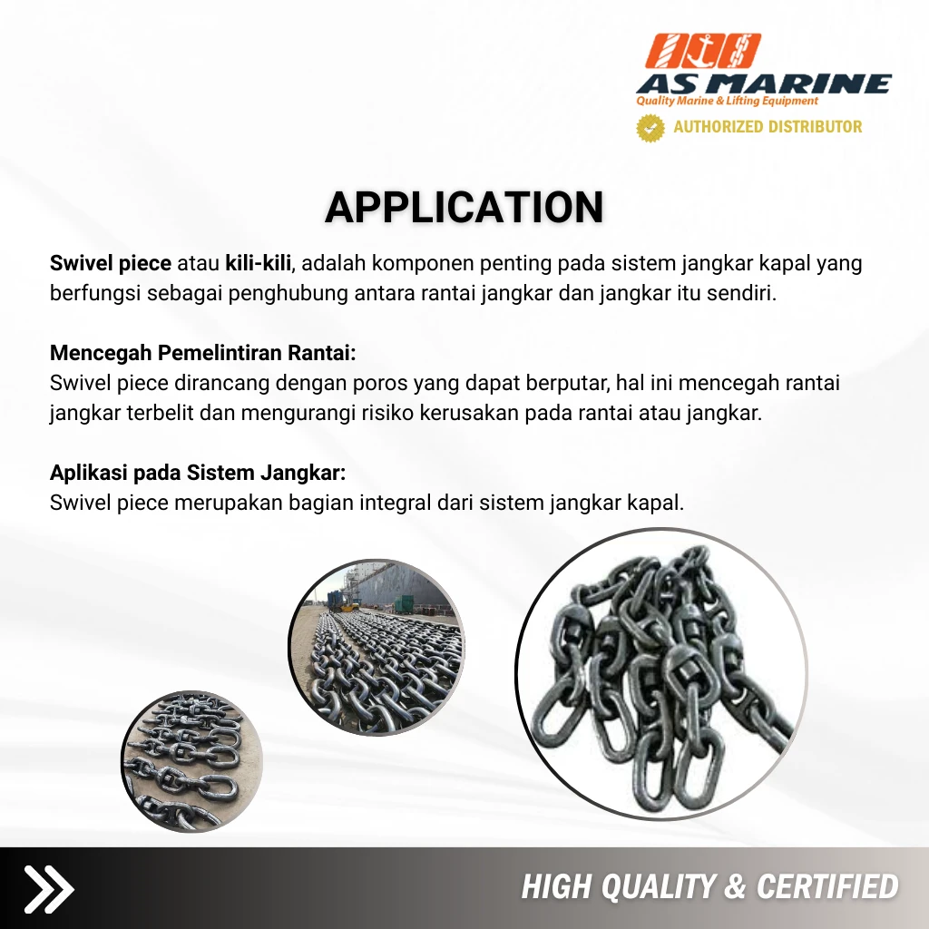 Swivel Piece Grade U2 memiliki sistem rotasi bebas 360°, memungkinkan rantai bergerak bebas tanpa menyebabkan lilitan atau kerusakan. Poduk ini memiliki perlindungan optimal terhadap karat dan korosi air laut, menjadikannya pilihan tepat untuk penggunaan pada kapal niaga, kapal nelayan, tongkang, dan rig offshore.
